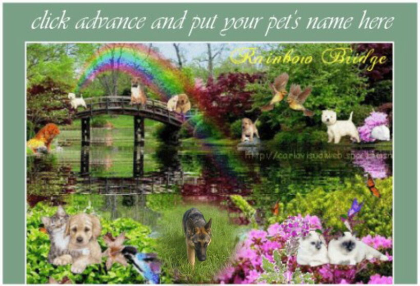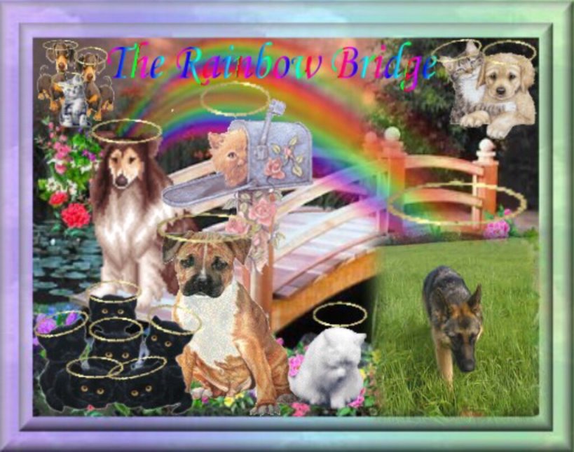 Wenn ihr wüsstet wo ich hin gehe, würdet ihr nicht weinen, denn mein Weg führt ins Rainbow - Land. Dort am Anfang der Brücke werde ich eines Tages auf euch warten. |