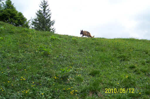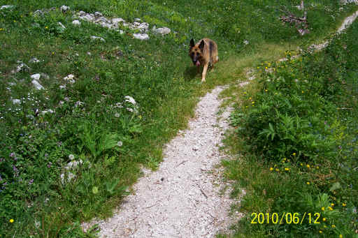 | Herrchen Rene kann sich auf mich verlassen das ich nicht weg laufe | und hier sind wir den Weg wieder von der Alm nach unten | bis wir auf einmal eine Meute Ziegen sahen, die wollten nämlich hoch und wir runter |
