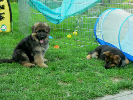 Nun schlafen wir auch nicht mehr in der Wurfhöhle, sondern nur noch vorne im Vorraum. Der ist ja groß genug für uns. Mama schläft noch nachts bei uns, damit uns keiner klauen kann :-) Man kann ja nie wissen, aber der Broncor ist ja auch noch da. An dem kommt keiner vorbei der hier nichts zu suchen. So fühle ich mich echt sicher und dann sind ja auch noch meine Leute da die auf mich und meine Geschwister auf passen. Im gesamten Zwingerbereich sind Kameras die Bärbel immer zeigen was wir machen , auch Nachts. Da hat Sie nämlich den Monitor neben dem Bett stehen und schaut dann oft was wir machen. Aber wir sind Nachts ganz ruhig und schlafen, legen uns nur manchmal auf die Decke und wenn es zu warm werden sollten auf den Boden, dass ist alles. Wir sind eben liebe Welpen, sagt Bärbel immer. Wir sind jetzt schon alle so munter das wir auch im Garten herum rennen dürfen. Den Welpenauslauf können Stephan und Nina ja für Ihr Kaninchen mit nehmen, damit ich es später nicht fangen kann wenn ich dort bin. Sind wir im Garten, laufen wir auch zu Broncors Auslauf hin und laufen da hin und her. Der will dann immer raus um mit uns zu spielen. Da Er aber so groß ist und so viel Power hat, darf Er das noch nicht. Er würde uns bestimmt überrennen meint Bärbel und Jürgen immer. Aber wenn wir größer sind, dann darf Er mit uns spielen. Stephan, Nina und Louis sind oft bei uns und spielen mit mir und meinen Geschwistern. Das finde ich echt toll, wird bestimmt echt lustig bei Ihnen. Wenn das Wetter ganz toll ist schlafen wir tagsüber manchmal im Auslauf, da ist es dann schön kühl im Schatten. Wenn die Futterküche aber los ist und ich sehe das , dann laufe ich da mit meinen Geschwistern gleich rein und dann legen wir uns da auf die kühlen Fliesen. Das ist echt toll. In der Zwischenzeit macht Bärbel unser Futter fertig. Das bekommen wir aber in unserem Zwinger oder wenn wir wollen auch mal im Auslauf. Da wir nicht jeder einen Futternapf haben wollen, futtern Fargos, Fenjah und ich aus einem großen Napf. Das klappt noch ganz gut, da unsere Köpfe ja noch nicht so groß sind. Wir mögen unser Futter ja wohl gerne, aber wenn da Fleischstückchen oder Quark drin sind, noch viel viel lieber. Dann ist der Napf ruck zuck leer. Danach laufen wir etwas herum bis wir uns gelöst haben. Anschließend sind wir so müde das wir schlafen gehen. Heute fing es auf einmal doll an zu regnen, bisher hatten wir immer Glück nie nass zu werden. Doch heute war das nicht der Fall, denn Bärbel und Jürgen wollten mal sehen was wir so machen. Zuerst haben wir in den Himmel geschaut und sind dann in den Zwinger neben der Futterküche gelaufen. Doch da wollten wir nicht lange bleiben und sind dann wieder in den Regen um zu unsere Wurfhöhle zu laufen. Da finden wir es immer noch am besten. Bärbel ist dann gekommen, hat uns trocken gerubbelt und dann hat Sie uns unsere Rinderohren zum Knabbern gegeben, unsere Mama raus geschickt und die Tür zu gemacht. Hatten wir nichts dagegen, denn Mama nimmt uns manchmal die Rinderohren oder die trockenen Brötchen die wir auch mögen weg, um alles auf zu futtern. Ja die hat eben auch immer Hunger wie ich auch. Man habe ich wieder viel erzählt, jetzt wird es aber Zeit das ich auf höre. Fotos habe ich natürlich auch wieder zum Anschauen gebracht. Bis zum nächsten Mal dann, euer Falk vom Speichersee |