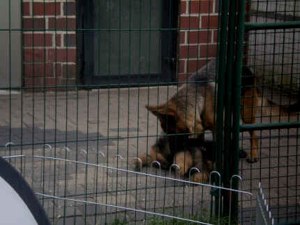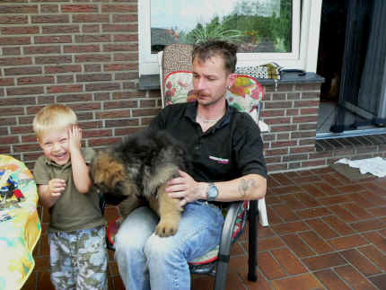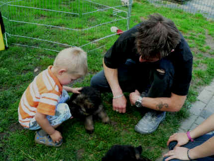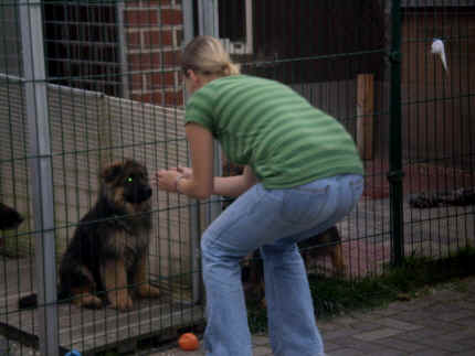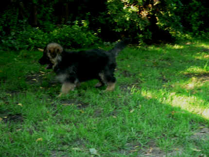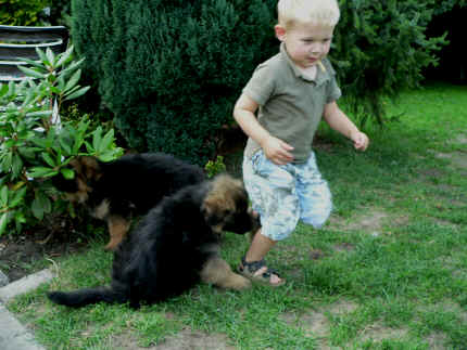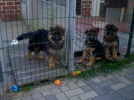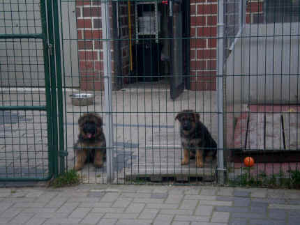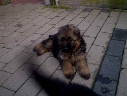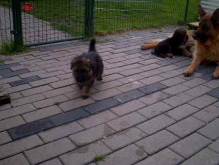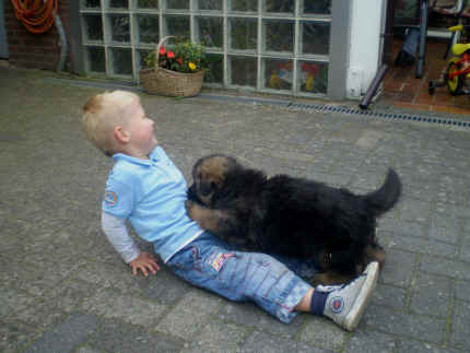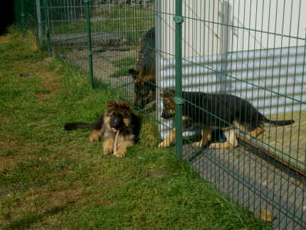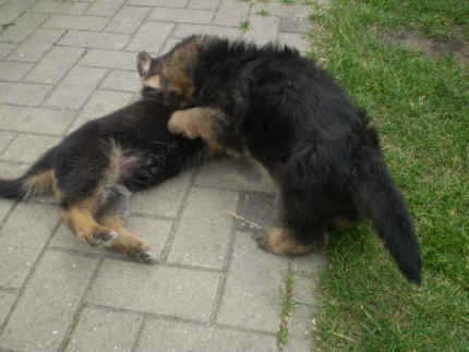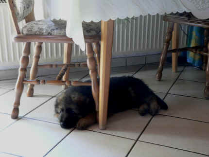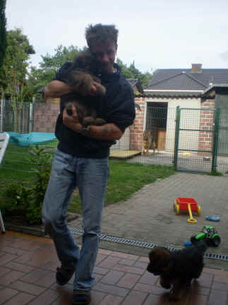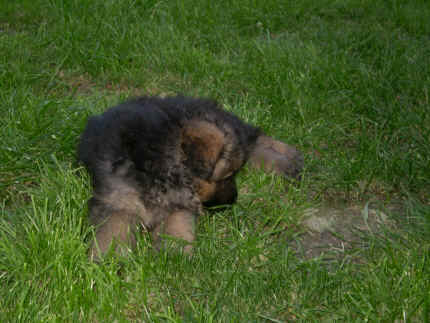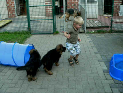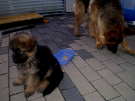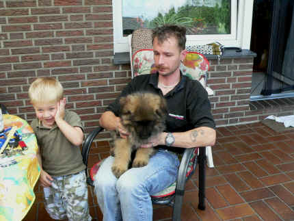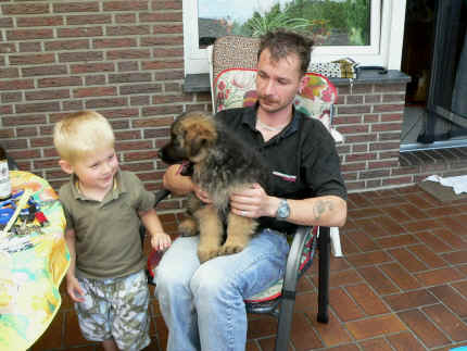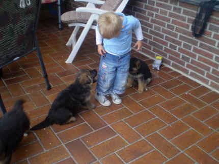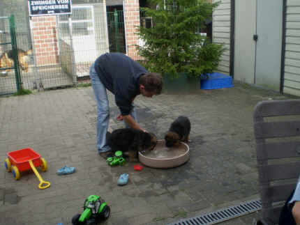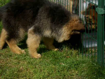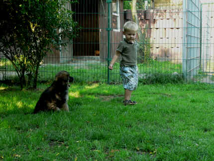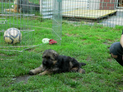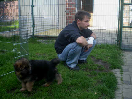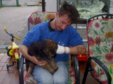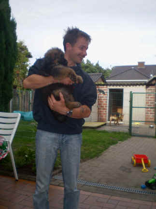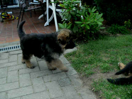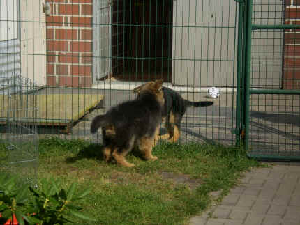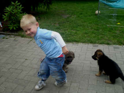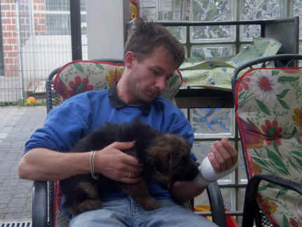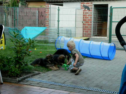Später kam der Louis wieder, natürlich Stephan, Nina und Chiara auch. Das werden nach dem Tätowieren meine neuen Leute. Ich mag sie jetzt schon und lustig wird es auch. Denn der Louis hat manchmal auch Blödsinn im Kopf wie ich auch. Rennt Louis los, bin ich gleich hinter Ihm her und dann geht die Post ab. Im Moment habe ich ja noch mit Fenjah und Fargos Verstärkung, doch bald bin ich ja alleine wenn ich bei Louis wohne. Aber ich werde das schon schaffen und außerdem besuchen wir ja Bärbel und Jürgen ganz oft. So sehe ich meine jetzigen Leute ja immer wieder, finde ich echt toll. Die Fenjah bleibt ja bei Bärbel und Jürgen zu Hause, nur der Fargos bekommt ein neues Herrchen. Der hat schon viele Fotos von Fargos bekommen. Jetzt spiele ich aber erst mal noch hier im Garten mit meinen Leuten, Fargos, Fenjah und Broncor. Den mag ich auch und laufe immer zu seinen Auslauf hin. Dan beschnuppern wir uns immer, Bärbel will jetzt auch das der Broncor zu uns darf, nur passen meine Leute auf, das Er nicht so wild wird. Der ist ja sooooo groß und wir noch sooooo klein, der kann uns echt noch um rennen. Das macht Mama aber leider auch öfters und dann purzle ich immer um. Aber ich bin sofort immer wieder auf den Beinen und laufe dann Mama hinter her und schimpfe dann mit Ihr. Leider stört Sie sich überhaupt nicht darum und macht das was Sie will weiter. Ist echt schwer mit den "Großen". Mit meinen Geschwistern gehe ich ja auch nicht immer zärtlich um. Es gibt Machtkämpfchen, aber nicht ernst gemeint. Sieht manchmal nur so schlimm aus, ehrlich. Doch so richtig haben wir den Boss noch nicht raus, einmal ist es Fenjah, dann der Fargos und dann wieder ich. Ich bin nämlich der Größte von uns Dreien, wenn auch nicht viel. Gestern war ich mit Stephan, Nina und Louis das erste Mal alleine Gassi. Wir sind bei uns rechts am Haus hoch und dann wollten die mit Louis zum Spielplatz. Aber die haben die Rechnung ohne mich gemacht. Bärbel war nicht mit und das fand ich nicht so toll. Ich wollte nach ein paar Metern nicht weiter, weil ich auch den Broncor und die Mama bellen gehört habe. Also habe ich mich auf die Straße gesetzt und bin sitzen geblieben. Da hat mich der Stephan auf den Arm genommen und getragen. Echt cool, muss ich mir merken. Der dachte nämlich ich kann nicht so weit laufen ( war ja sowieso nicht so weit ) , ist ja echt lustig. Als wir wieder zu Hause waren, bin ich gleich zu Fargos, Fenjah und Bärbel hin. Bärbel hatte sich das schon gedacht, was ich so mache um schnell wieder nach Hause zu kommen. Weg war meine Müdigkeit, grins. Ja so lustig finde ich das alles und tobe munter im Garten und Auslauf umher. Aber im Haus bin ich auch gerne und habe da schon jedes Zimmer kennen gelernt. Auf den Fliesen war es schön kühl und ich bin schnell eingeschlafen. Wenn es Nacht wird, da schlafe ich mit Fenjah und Fargos im Zwinger, unsere Mama schläft ja schon im Haus, damit Sie auch mal wieder gut schlafen kann. Als Sie noch immer bei uns geschlafen hat, haben wir Sie oft in der nacht geweckt. Am anderen Morgen wenn Sie dann ins Haus durfte, hat Sie erst mal tief und fest geschlafen. Ja wir 3 Welpen haben Power ohne Ende. Nun aber genug, denn es ist schon wieder viel zu spät geworden. Frauchen muss nun auch schlafen und ich liege ja auch schon bei Fargos und Fenjah. Bilder sind ja nun genug von mir zu sehen, viel Spaß beim Anschauen, euer Falk von Speichersee |