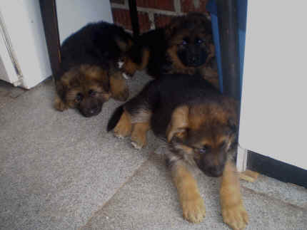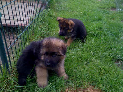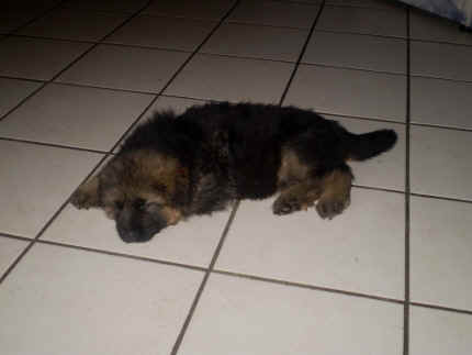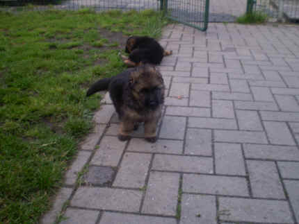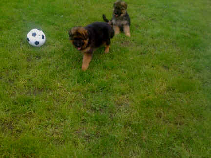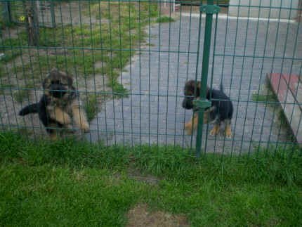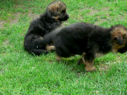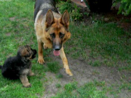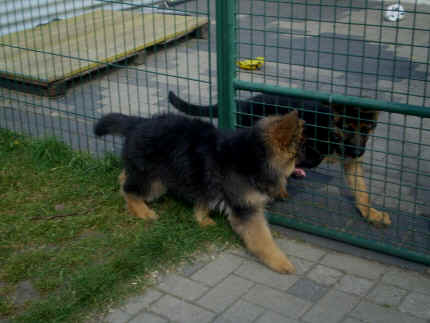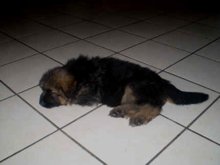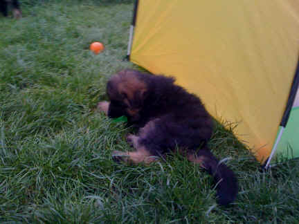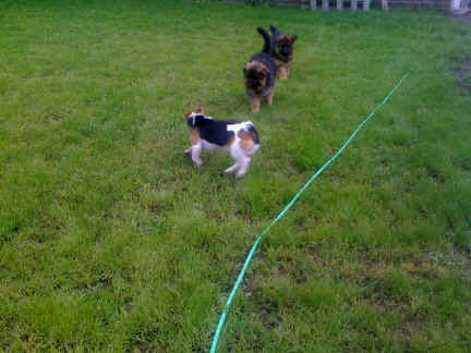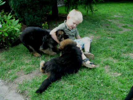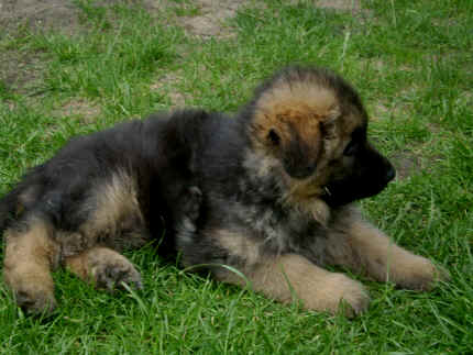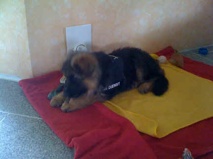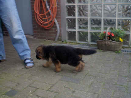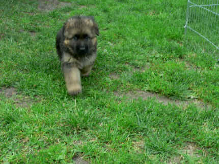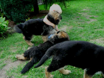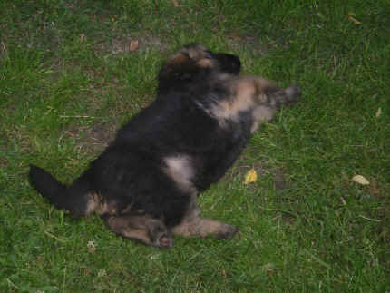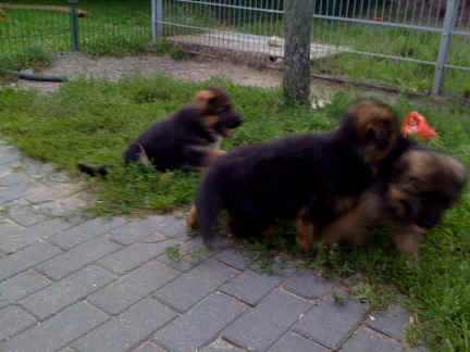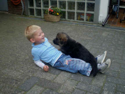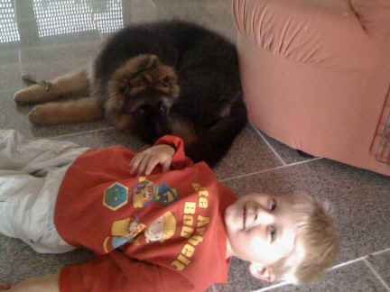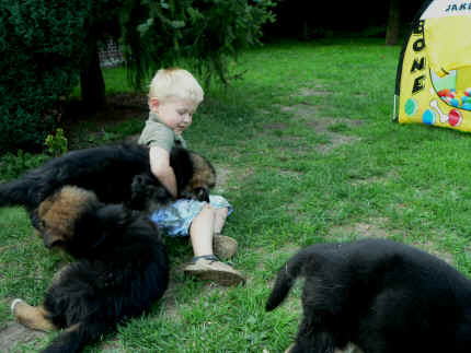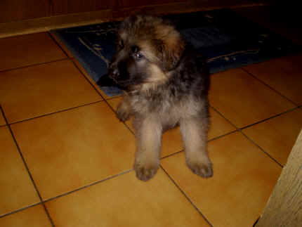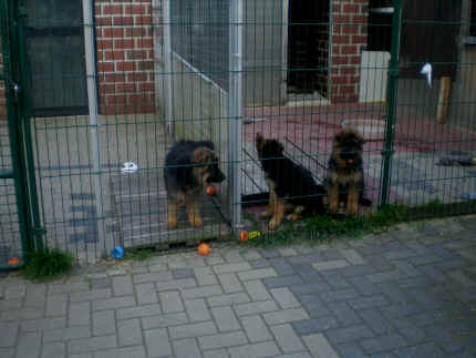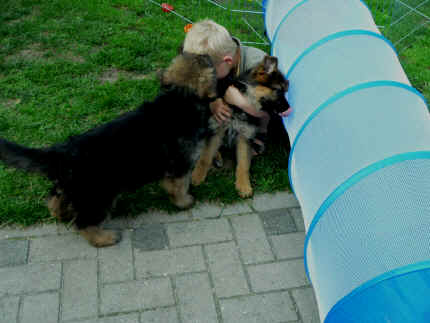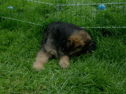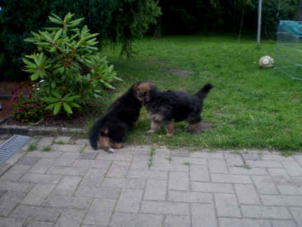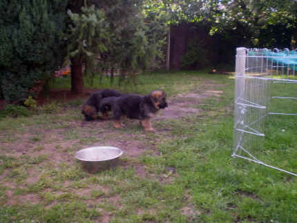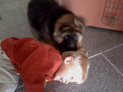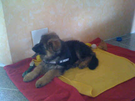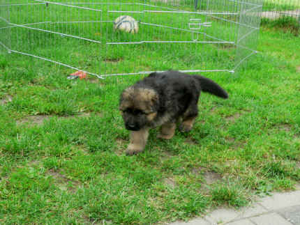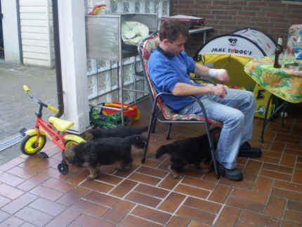 Später kam der Louis wieder, natürlich Stephan, Nina und Chiara auch. Das werden nach dem Tätowieren meine neuen Leute. Ich mag sie jetzt schon und lustig wird es auch. Denn der Louis hat manchmal auch Blödsinn im Kopf wie ich auch. Rennt Louis los, bin ich gleich hinter Ihm her und dann geht die Post ab. Im Moment habe ich ja noch mit Fenjah und Fargos Verstärkung, doch bald bin ich ja alleine wenn ich bei Louis wohne. Aber ich werde das schon schaffen und außerdem besuchen wir ja Bärbel und Jürgen ganz oft. So sehe ich meine jetzigen Leute ja immer wieder, finde ich echt toll. Die Fenjah bleibt ja bei Bärbel und Jürgen zu Hause, nur der Fargos bekommt ein neues Herrchen. Der hat schon viele Fotos von Fargos bekommen. Jetzt spiele ich aber erst mal noch hier im Garten mit meinen Leuten, Fargos, Fenjah und Broncor. Den mag ich auch und laufe immer zu seinen Auslauf hin. Dan beschnuppern wir uns immer, Bärbel will jetzt auch das der Broncor zu uns darf, nur passen meine Leute auf, das Er nicht so wild wird. Der ist ja sooooo groß und wir noch sooooo klein, der kann uns echt noch um rennen. Das macht Mama aber leider auch öfters und dann purzle ich immer um. Aber ich bin sofort immer wieder auf den Beinen und laufe dann Mama hinter her und schimpfe dann mit Ihr. Leider stört Sie sich überhaupt nicht darum und macht das was Sie will weiter. Ist echt schwer mit den "Großen". Mit meinen Geschwistern gehe ich ja auch nicht immer zärtlich um. Es gibt Machtkämpfchen, aber nicht ernst gemeint. Sieht manchmal nur so schlimm aus, ehrlich. Doch so richtig haben wir den Boss noch nicht raus, einmal ist es Fenjah, dann der Fargos und dann wieder ich. Ich bin nämlich der Größte von uns Dreien, wenn auch nicht viel. Gestern war ich mit Stephan, Nina und Louis das erste Mal alleine Gassi. Wir sind bei uns rechts am Haus hoch und dann wollten die mit Louis zum Spielplatz. Aber die haben die Rechnung ohne mich gemacht. Bärbel war nicht mit und das fand ich nicht so toll. Ich wollte nach ein paar Metern nicht weiter, weil ich auch den Broncor und die Mama bellen gehört habe. Also habe ich mich auf die Straße gesetzt und bin sitzen geblieben. Da hat mich der Stephan auf den Arm genommen und getragen. Echt cool, muss ich mir merken. Der dachte nämlich ich kann nicht so weit laufen ( war ja sowieso nicht so weit ) , ist ja echt lustig. Als wir wieder zu Hause waren, bin ich gleich zu Fargos, Fenjah und Bärbel hin. Bärbel hatte sich das schon gedacht, was ich so mache um schnell wieder nach Hause zu kommen. Weg war meine Müdigkeit, grins. Ja so lustig finde ich das alles und tobe munter im Garten und Auslauf umher. Aber im Haus bin ich auch gerne und habe da schon jedes Zimmer kennen gelernt. Auf den Fliesen war es schön kühl und ich bin schnell eingeschlafen. Wenn es Nacht wird, da schlafe ich mit Fenjah und Fargos im Zwinger, unsere Mama schläft ja schon im Haus, damit Sie auch mal wieder gut schlafen kann. Als Sie noch immer bei uns geschlafen hat, haben wir Sie oft in der nacht geweckt. Am anderen Morgen wenn Sie dann ins Haus durfte, hat Sie erst mal tief und fest geschlafen. Ja wir 3 Welpen haben Power ohne Ende. Nun aber genug, denn es ist schon wieder viel zu spät geworden. Frauchen muss nun auch schlafen und ich liege ja auch schon bei Fargos und Fenjah. Bilder sind ja nun genug von mir zu sehen, viel Spaß beim Anschauen, euer Falk von Speichersee |