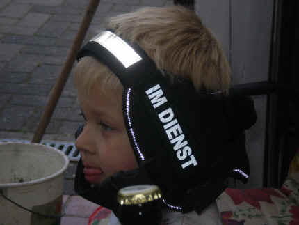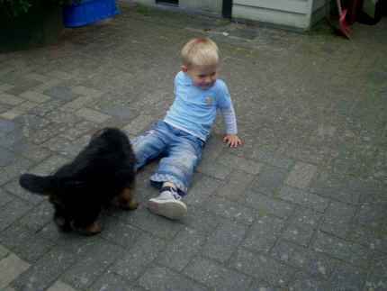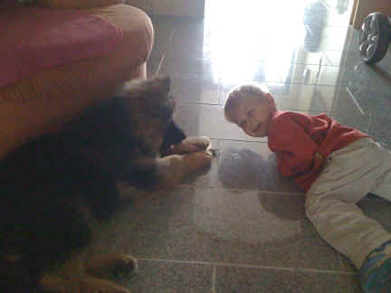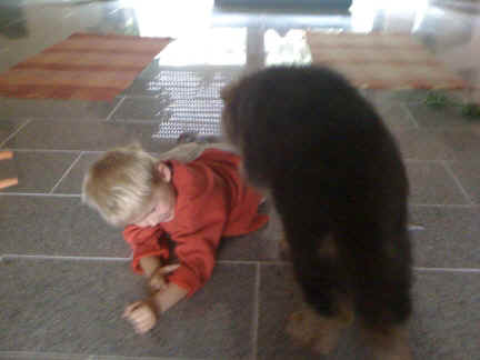| na Mama, einmal nur zwicken, tut auch nicht weh | man die versteht aber heute echt keinen Spaß | ja und das ist mein kleines Herrchen Louis, der mein Geschirr ganz toll findet, aber ob es da wohl hin gehört? |