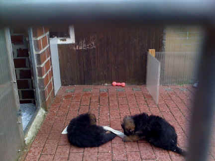 | hi Fenjah, ich bin wieder da. Alles klar ? | schade das Du gerade Dein Futter auf hast, sonst hätten wir echt toben können | dann nage ich mal so lange an Deiner Kaustange herum und Broncor schaut zu |