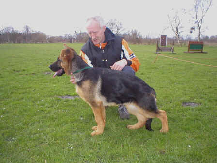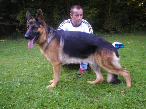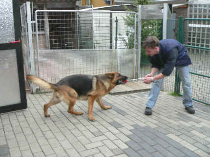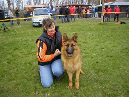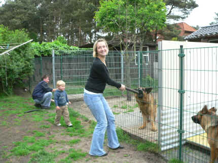 dazu gehöre ich, Bärbel , mein Mann Jürgen und meine Schwiegermutter und seit Mitte Februar Stephan.. Links seht Ihr unsere erste Zuchthündin, Wibke v. Haus Babilon mit Ihrer Tochter Angy vom Speichersee. In der Mitte auf dem Foto erzählt Jürgen Wibke und Angy etwas von der Unterordnung und die Beiden hören gut zu. Dann nicht die Mutter vergessen, die unsere Hunde immer sehr gut versorgt, wenn wir weg sind auf Schauen oder zu anderen Verpflichtungen. Wir sind sehr froh, dass wir Sie bei uns haben. Unser Sohn Stephan , mit seiner Frau Nina und deren Kindern Chiara und Louis.. Später seht Ihr noch Fotos von allen. Wir würden uns wünschen wenn unser Sohn Stephan wieder ein festes Mitglied in unserem Team werden würde. . Wir freuen uns, dass Er nun aktiv dabei ist. Leider lässt seine Arbeit es zur Zeit nicht immer zu, das Er unsere Hunde führen kann. Dann möchte ich auch nicht die Kinder aus der Nachbarschaft vergessen, die immer wieder mal zu uns kommen, um dann mit den Welpen zu spielen. So lernen diese dann auch das Sozialverhalten, was für sie später sehr wichtig ist. Einen privaten Schutzdienst - Helfer hatten oder haben wir auch. E heißt Jürgen S. trainieren wir unsere Hunde für die Prüfungen. Jürgen, ist ein sehr guter Helfer. Unsere Hunde sind im Schutzdienst sehr gut von Ihm ausgebildet worden und wir können überall, egal ob auf dem Hundeplatz, im Wald, auf einem Weg, einfach überall unsere Hunde vorführen. Auch Ihm ein großes Danke. In Rhede hatten wir auch eine Führerin die wir hier auch vorstellen möchten. Es ist Julia Schmidt vom Zwinger vom Nordteich. Sie führte Bayra, die jetzt in Belgien ist, Brisby und Broncor und auch Orsa und Chandrah. Auf Ausstellungen hat Sie Bayra auf einen guten Platz geführt. Auch dafür vielen Dank an Julia. Sven Pauker vom Akazien - Wäldchen war auf Ausstellungen der Führer von Broncor. Die Beiden gaben ein wunderbares Team ab. Er konnte Broncor gut händeln, dafür möchten wir uns bedanken. Auch auf der SHZS in Ulm in Jahr ( 2005 ) hat Sven unseren Broncor ge führt. Dafür hat er auch ein Danke verdient. Dann möchten wir uns auch bei Rudi K. bedanken, der auch in unserer OG ist. Er hat auch für unsere Hunde den Helfer gemacht und auch mal im Ring zum Training geführt. Er hat nun unsere Dayrah übernommen und wird Sie zu den Schutzhundprüfungen , Körung und Schauen bringen. Auch Ihm ein Danke! Seien Frau Petra, die auch meine Freundin ist, ist auch immer mit von der Partie. In der Zwischenzeit kamen noch einige Würfe dazu. Aus denen wir Chandrah behalten haben, Ihr Sohn Enjes Kahn steht nun bei unserem Freund Amador in Spanien. Nun haben wir mit Chandrah und Djenges Kahn, unserem F - Wurf eine Wurfwiederholung geplant. Chandrah wird am 13. - 15 . Juni Ihre Welpen zur Welt bringen, aus diesem Wurf werden wir uns noch eine Hündin nehmen. |
