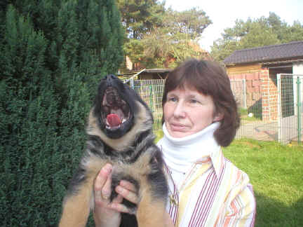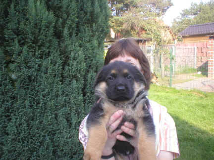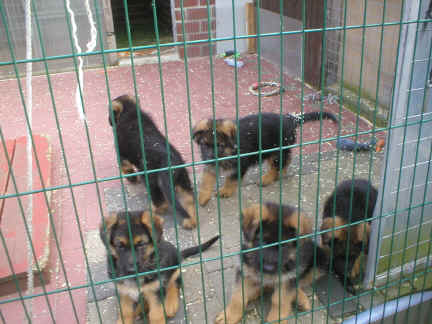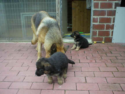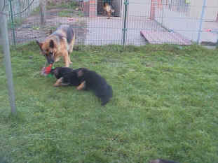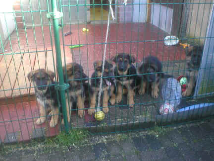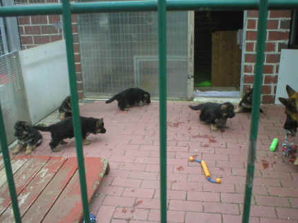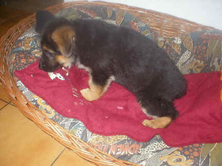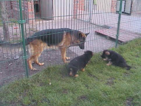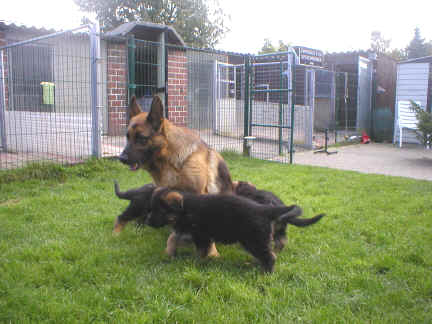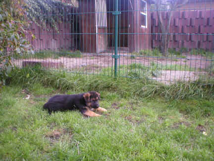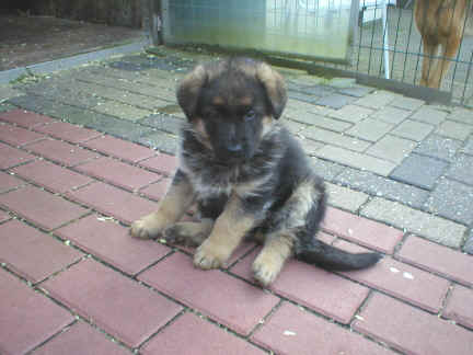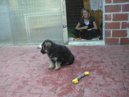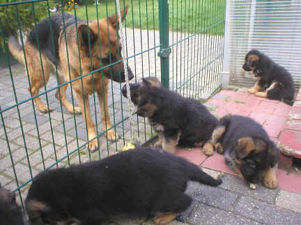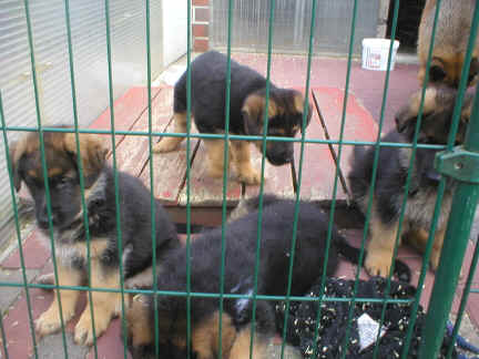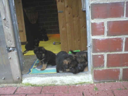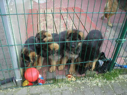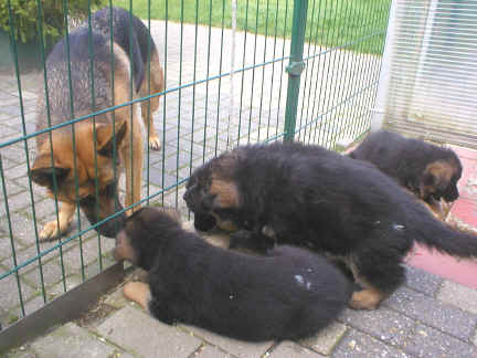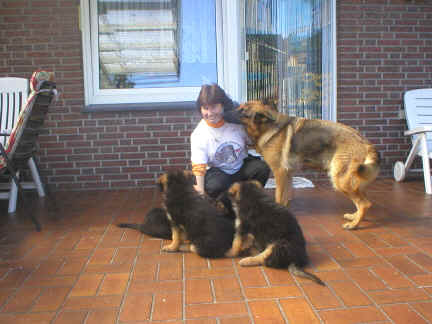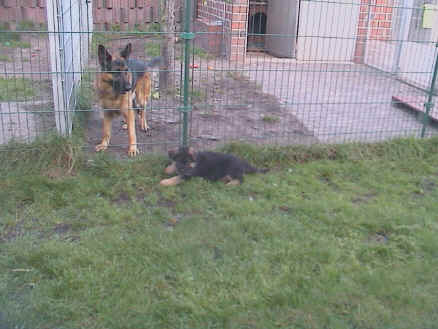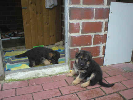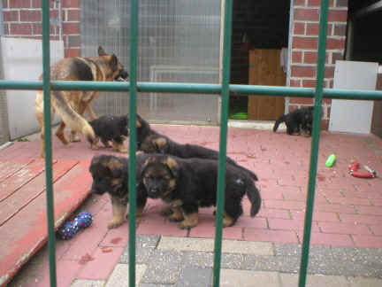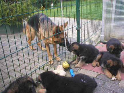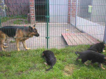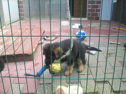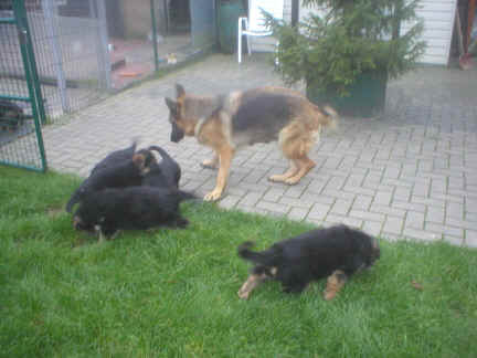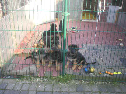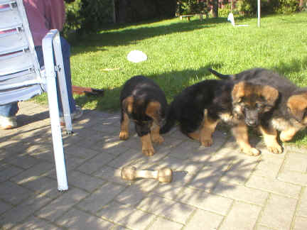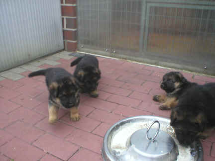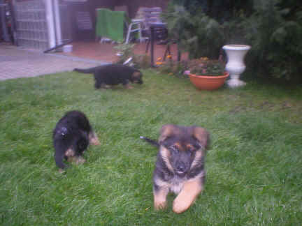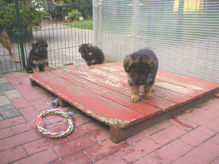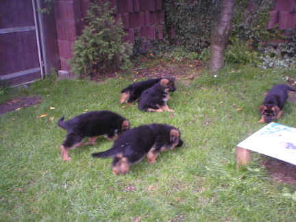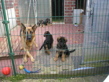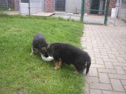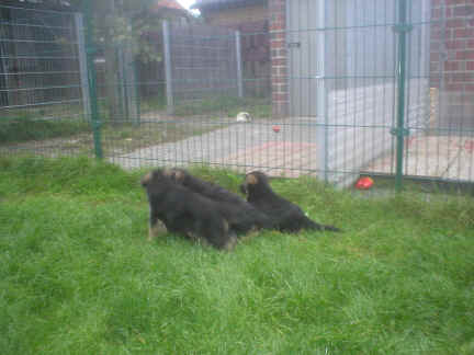 Uns geht es einfach prächtig und wir sind schon richtige kleine Schäferhunde geworden die auch schon bellen und knurren können. Untereinander machen wir auch schon richtige kleine Machtkämpfe, die aber nicht "blutig" sind :-)Hört sich immer nur gefährlich an. Wir sind aber ansonsten liebe kleine Welpchen, die nur ab und zu Krach machen. Dafür nehmen wir den Tag, Nachts sind wir anständig und schlafen und jaulen und bellen nicht wie ein kleiner Welpe bei uns in der Nähe. Den hören wir ganz ganz oft und die Bärbel dachte schon, das wir Nachts mit bellen. Unser Frauchen weiß aber wie wir als Welpen Nachts ruhig sind. Einfach unser Spielzeug und leckere Kaustangen oder Ähnliches in den Schlafraum bringen. Schon haben wir was zu tun und sind ruhig, Irgendwann schlafen wir dann ein und werden erst morgens zwischen 6.30 und 7.00 Uhr wach. Dann wollen wir aber schnell raus denn wir wollen ja unser Geschäft machen. Leider passiert es noch, das Bärbel auch mal morgens unser Geschäftchen weg machen muss. Wir sind ja noch so klein und dürfen das. Wenn wir etwas älter sind, dann melden wir uns aber. Nachts wollen wir ja nicht stören, also gehen wir in die Streuecke hin. Das Wetter ist ja zur Zeit trocken und wir sind dann den ganzen Tag draußen. Mittlerweile haben wir nun 3 Zwinger und 2 Ausläufe zum herum toben und die Wiese auch noch. Wir sollen uns schon an den anderen Zwinger gewöhnen, da wir bald umziehen werden. Da soll unsere Freundin dann rein. Kein Problem, machen wir doch gerne. Da sind wir nämlich noch näher an der Futterküche. Bärbel ist da ja so oft und macht unsere Mahlzeiten fertig. Zur Zeit bekommen wir 4 Mahlzeiten. Zwischendurch mögen wir sehr gerne getrocknete Brötchen, auch gerne mit Körner. Also liebe neue Eigentümer, bitte vorsorgen. Nicht die Rinderohren, Schweineohren, Ochsenziemer , Kauschuhe und Büffelhautknochen besorgen, dann sind wir auch ganz lieb und janken nicht nach Mama, Papa und Geschwister, Bärbel, Jürgen und Mutter Emmi nicht vergessen. |