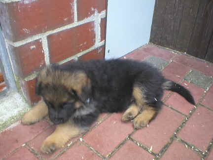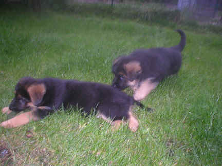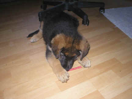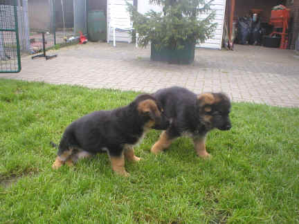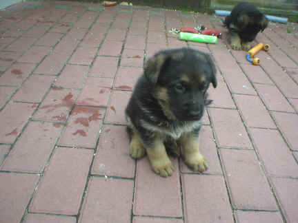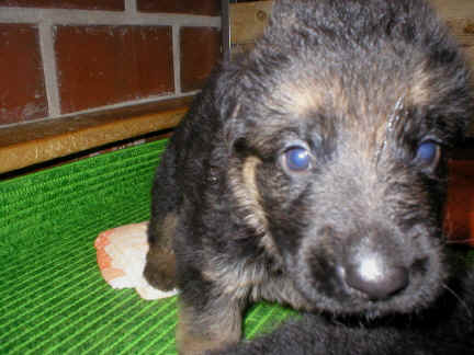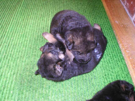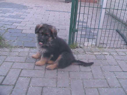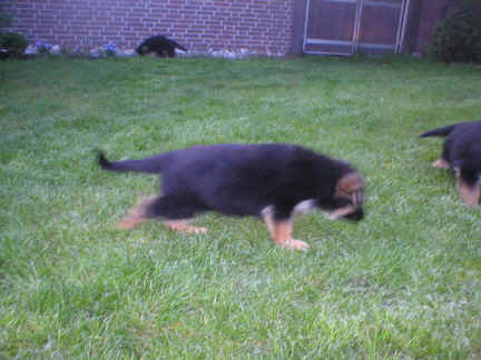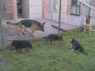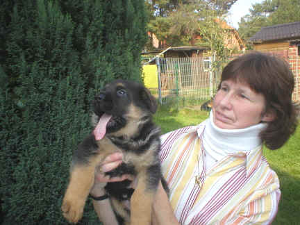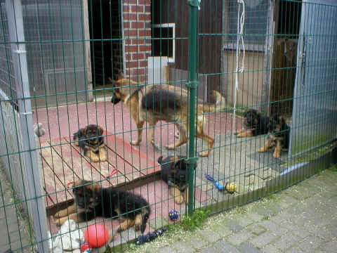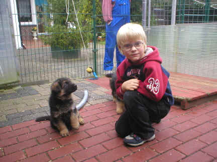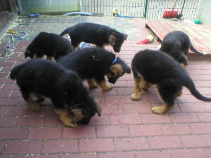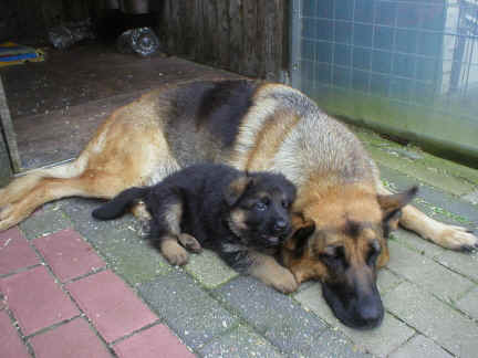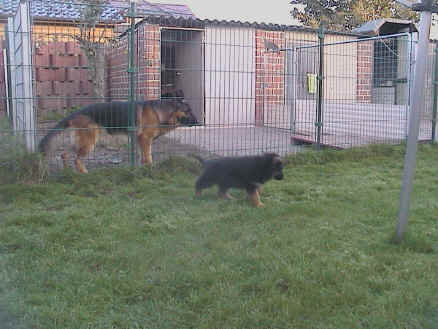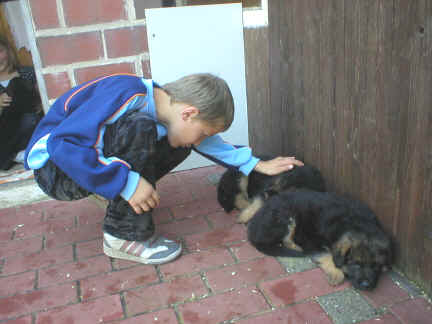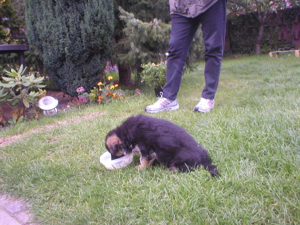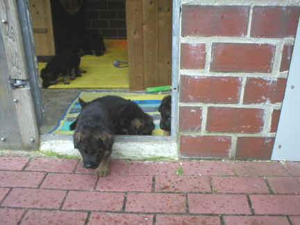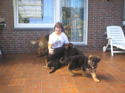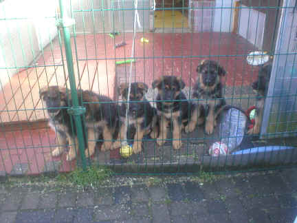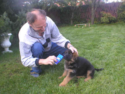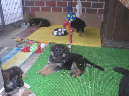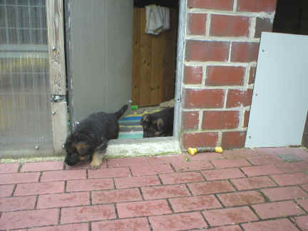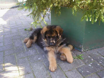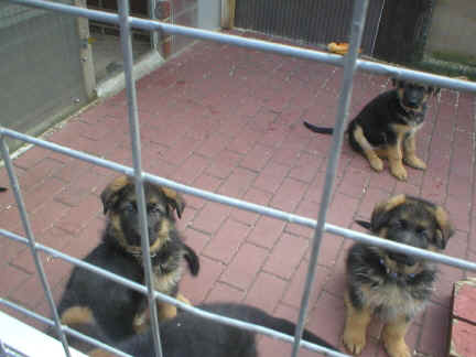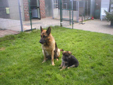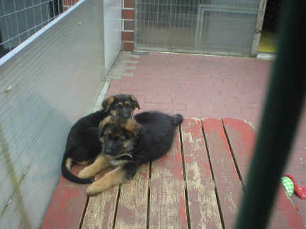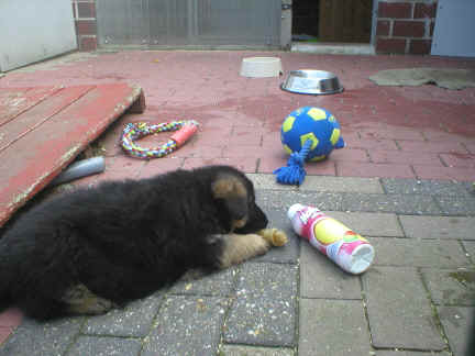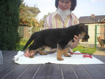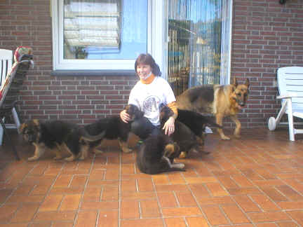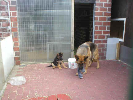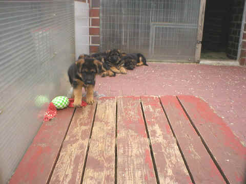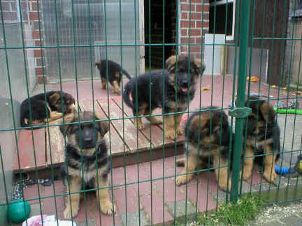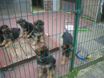 Uns geht es einfach prächtig und wir sind schon richtige kleine Schäferhunde geworden die auch schon bellen und knurren können. Untereinander machen wir auch schon richtige kleine Machtkämpfe, die aber nicht "blutig" sind :-)Hört sich immer nur gefährlich an. Wir sind aber ansonsten liebe kleine Welpchen, die nur ab und zu Krach machen. Dafür nehmen wir den Tag, Nachts sind wir anständig und schlafen und jaulen und bellen nicht wie ein kleiner Welpe bei uns in der Nähe. Den hören wir ganz ganz oft und die Bärbel dachte schon, das wir Nachts mit bellen. Unser Frauchen weiß aber wie wir als Welpen Nachts ruhig sind. Einfach unser Spielzeug und leckere Kaustangen oder Ähnliches in den Schlafraum bringen. Schon haben wir was zu tun und sind ruhig, Irgendwann schlafen wir dann ein und werden erst morgens zwischen 6.30 und 7.00 Uhr wach. Dann wollen wir aber schnell raus denn wir wollen ja unser Geschäft machen. Leider passiert es noch, das Bärbel auch mal morgens unser Geschäftchen weg machen muss. Wir sind ja noch so klein und dürfen das. Wenn wir etwas älter sind, dann melden wir uns aber. Nachts wollen wir ja nicht stören, also gehen wir in die Streuecke hin. Das Wetter ist ja zur Zeit trocken und wir sind dann den ganzen Tag draußen. Mittlerweile haben wir nun 3 Zwinger und 2 Ausläufe zum herum toben und die Wiese auch noch. Wir sollen uns schon an den anderen Zwinger gewöhnen, da wir bald umziehen werden. Da soll unsere Freundin dann rein. Kein Problem, machen wir doch gerne. Da sind wir nämlich noch näher an der Futterküche. Bärbel ist da ja so oft und macht unsere Mahlzeiten fertig. Zur Zeit bekommen wir 4 Mahlzeiten. Zwischendurch mögen wir sehr gerne getrocknete Brötchen, auch gerne mit Körner. Also liebe neue Eigentümer, bitte vorsorgen. Nicht die Rinderohren, Schweineohren, Ochsenziemer , Kauschuhe und Büffelhautknochen besorgen, dann sind wir auch ganz lieb und janken nicht nach Mama, Papa und Geschwister, Bärbel, Jürgen und Mutter Emmi nicht vergessen. |