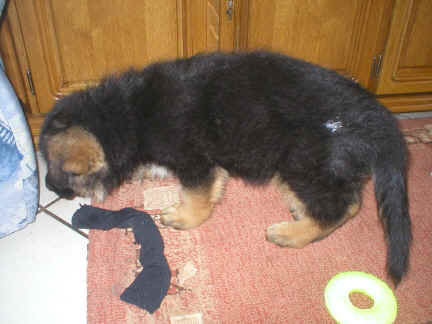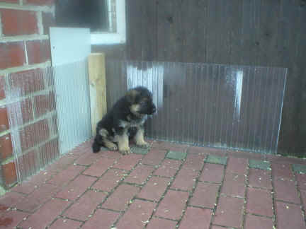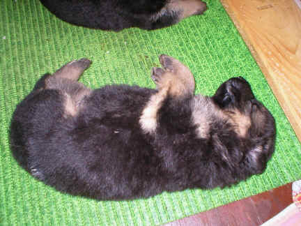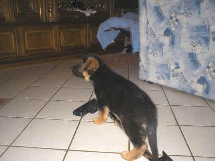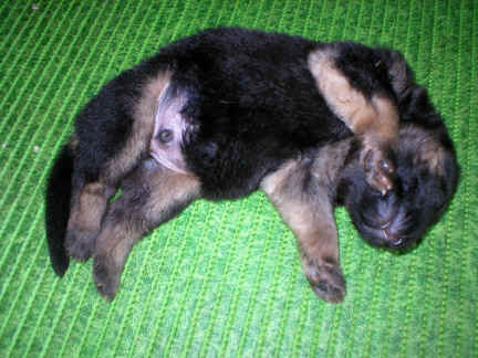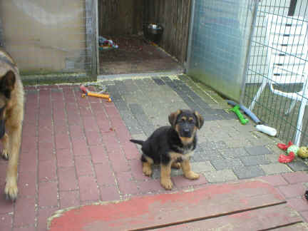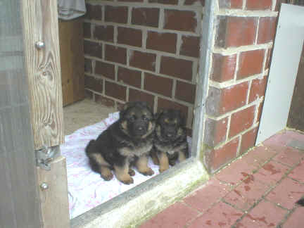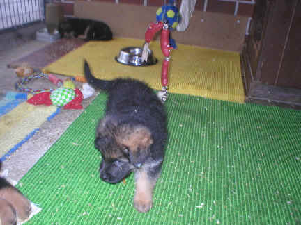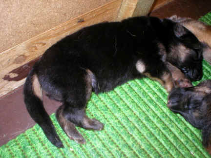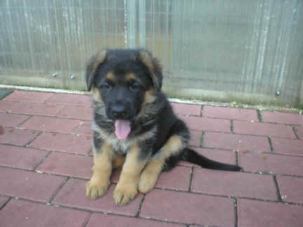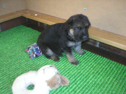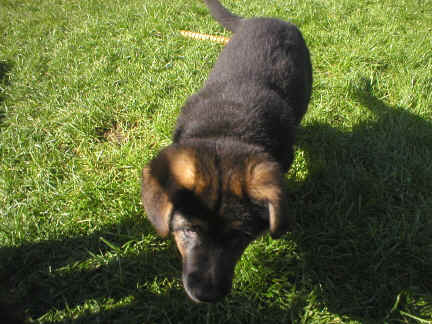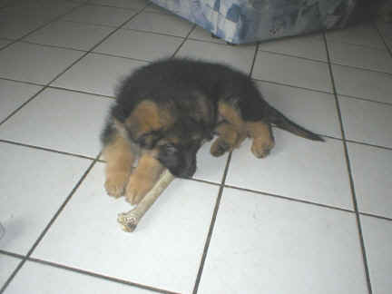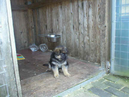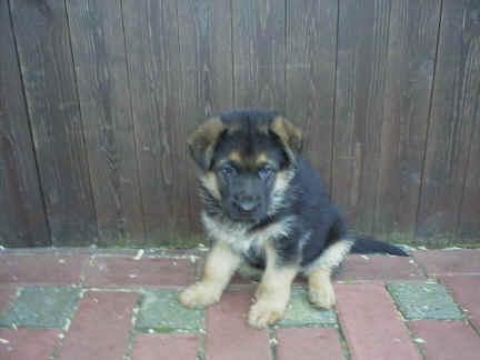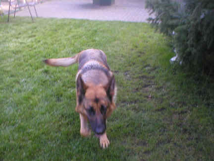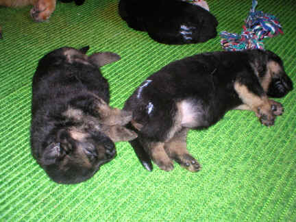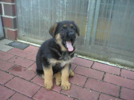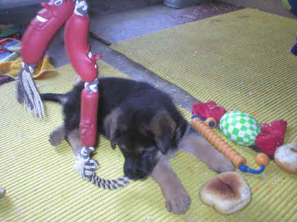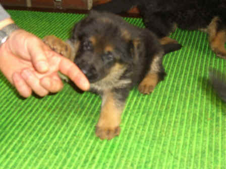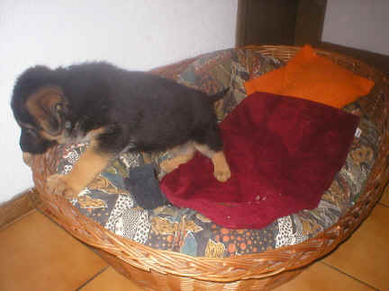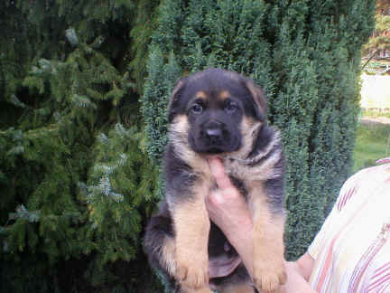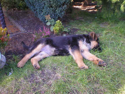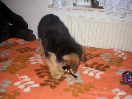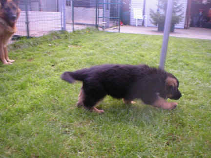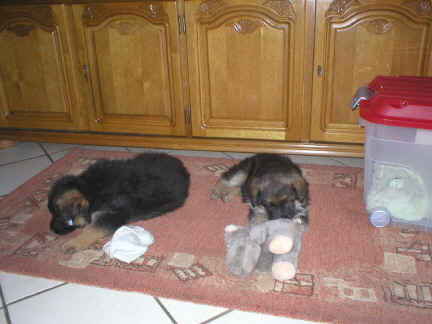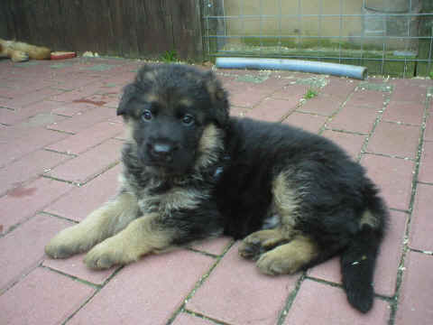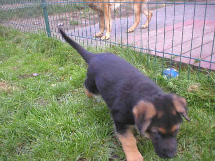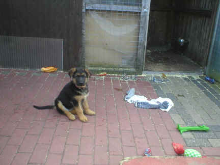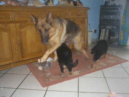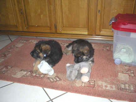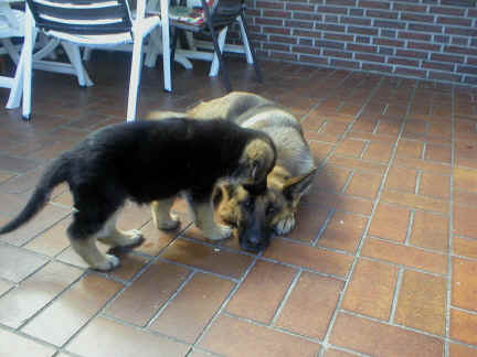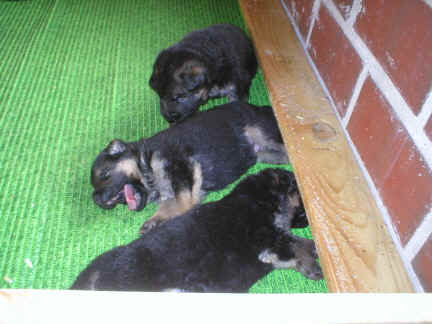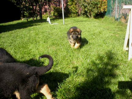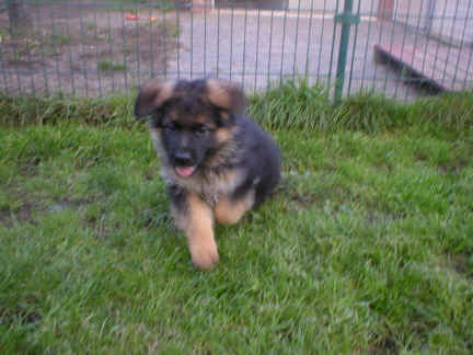 Uns geht es einfach prächtig und wir sind schon richtige kleine Schäferhunde geworden die auch schon bellen und knurren können. Untereinander machen wir auch schon richtige kleine Machtkämpfe, die aber nicht "blutig" sind :-)Hört sich immer nur gefährlich an. Wir sind aber ansonsten liebe kleine Welpchen, die nur ab und zu Krach machen. Dafür nehmen wir den Tag, Nachts sind wir anständig und schlafen und jaulen und bellen nicht wie ein kleiner Welpe bei uns in der Nähe. Den hören wir ganz ganz oft und die Bärbel dachte schon, das wir Nachts mit bellen. Unser Frauchen weiß aber wie wir als Welpen Nachts ruhig sind. Einfach unser Spielzeug und leckere Kaustangen oder Ähnliches in den Schlafraum bringen. Schon haben wir was zu tun und sind ruhig, Irgendwann schlafen wir dann ein und werden erst morgens zwischen 6.30 und 7.00 Uhr wach. Dann wollen wir aber schnell raus denn wir wollen ja unser Geschäft machen. Leider passiert es noch, das Bärbel auch mal morgens unser Geschäftchen weg machen muss. Wir sind ja noch so klein und dürfen das. Wenn wir etwas älter sind, dann melden wir uns aber. Nachts wollen wir ja nicht stören, also gehen wir in die Streuecke hin. Das Wetter ist ja zur Zeit trocken und wir sind dann den ganzen Tag draußen. Mittlerweile haben wir nun 3 Zwinger und 2 Ausläufe zum herum toben und die Wiese auch noch. Wir sollen uns schon an den anderen Zwinger gewöhnen, da wir bald umziehen werden. Da soll unsere Freundin dann rein. Kein Problem, machen wir doch gerne. Da sind wir nämlich noch näher an der Futterküche. Bärbel ist da ja so oft und macht unsere Mahlzeiten fertig. Zur Zeit bekommen wir 4 Mahlzeiten. Zwischendurch mögen wir sehr gerne getrocknete Brötchen, auch gerne mit Körner. Also liebe neue Eigentümer, bitte vorsorgen. Nicht die Rinderohren, Schweineohren, Ochsenziemer , Kauschuhe und Büffelhautknochen besorgen, dann sind wir auch ganz lieb und janken nicht nach Mama, Papa und Geschwister, Bärbel, Jürgen und Mutter Emmi nicht vergessen. |