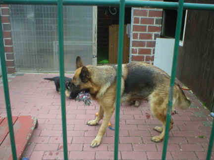 | wer steht denn da ? Soll das auch ein Schäferhund sein | Spielstunde, aber dieses Mal im Auslauf und Zwinger | warte Bärbel , ich komme zu Dir |