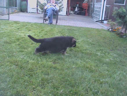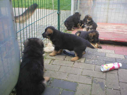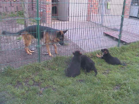 Die Chandrah würde am liebsten mit uns im Garten toben, aber des geht natürlich nicht. Wir sind ja noch viel zu klein und Sie viel zu schnell. Aber Sie kommt immer zu uns an das Gitter und dann laufen wir zu ihr hin und begrüßen uns alle gegenseitig. Ist eine ganz liebe, das findet auch unsere Mama, die nichts dagegen hat. Der Broncor, unser Papa, schaut uns vom Weitem zu. Der kann wohl noch nichts mit uns anfangen. Den möchten wir auch mal richtig kennen lernen. Aber Er kommt ja zwischendurch auch zu uns an den Zaun oder wir zu seinem wenn wir im Garten herum toben. Viele Leute haben wir auch schon kennen gelernt und Kinder sind auch dabei. Die streicheln uns immer alle. Scheinen lieb zu sein. Ja wir müssen ja alles kennen lernen, damit wir wenn wir zu unseren neuen Leuten kommen, auch was kennen. Bärbel geht auch mit uns zur Straße, wo die Autos und Fahrräder fahren. Es gibt ja so viel kennen zu lernen. Heute ist das Wetter etwas blöd, doch bis um 16.00 Uhr konnten wir noch Draußen herum tollen, dann kam der blöde Regen und später noch ein Gewitter. Das haben wir noch nicht kennen gelernt, aber bis jetzt stört es uns nicht. Bärbel hat uns dann in unseren Zwinger gebracht, damit wir nicht zu nass werden. Ist nicht immer so einfach, denn sind einige von uns im Zwinger, und der nächste soll rein, wollen die anderen wieder raus. Also ein Trick von Bärbel: Leckerlis bereit halten, und dann schnell sein, um durch die Tür zu kommen. Manchmal halten wir uns an den Hosenbeinen fest, oder an den Schnürsenkeln. Das hilft, dann Bärbel bückt sich dann zu uns runter und spielt noch etwas mit uns. Nachher gibt es wieder Futter, hoffentlich regnet es dann nicht mehr und wir dürfen wieder raus. Bis zum nächsten Mal, die Speichersee - Welpen |