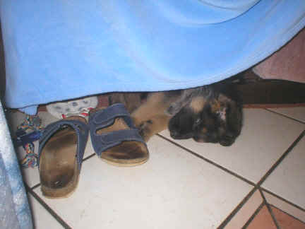 | Dixie schneidet den Fluchtweg ab, was nun ? | waren hier nicht mal Läufer und der Wassernapf ? | man sind wir müde, vor Bärbels Computer machen wir ein Nickerchen |
