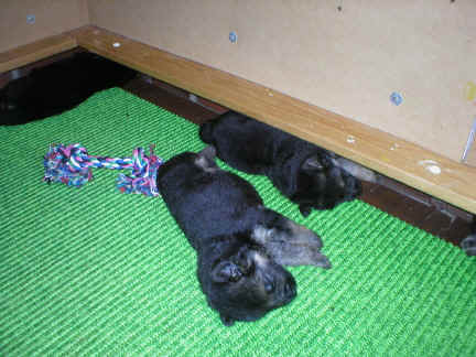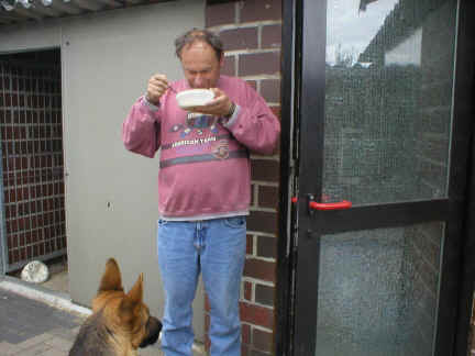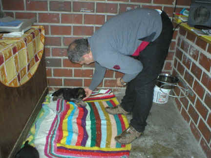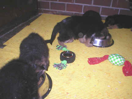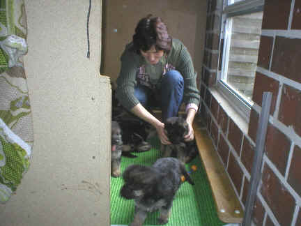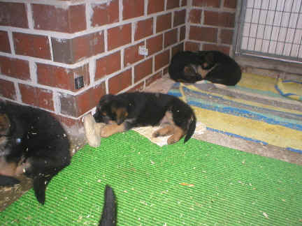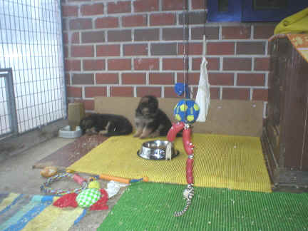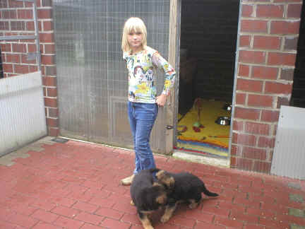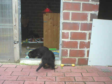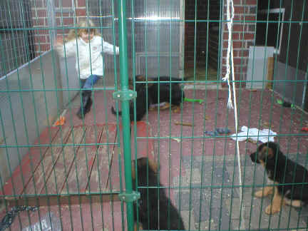 | wir futtern ein paar Futterbrocken und Bärbel macht den Zwinger sauber | na sind wir alle zu sehen oder fehlt einer ? | na mach doch schon, wir wollen spielen |