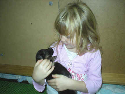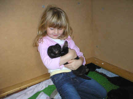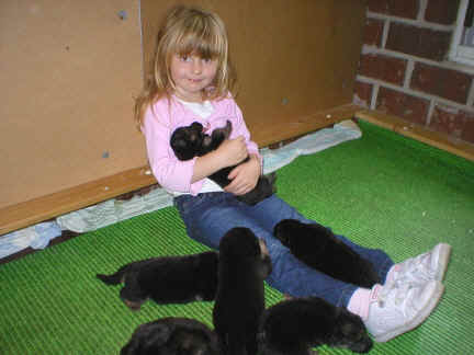 Wir haben nämlich eine blöde Angewohnheit. Damit unsere Mama uns nicht im Schlaf zerdrückt, hat Jürgen rings herum im Wurfraum eine Leiste angebracht. Da können wir drunter, wenn es zu eng für uns werden würde. Aber ob es eng ist oder nicht, es ist unser Stammplatz geworden. Alle legen wir uns unter die Bretter, dabei wird es langsam eng für uns. Denn wir sind größer und schwerer geworden und passen kaum noch darunter. Einer alleine würde ja noch gehen, aber wir streiten uns um den besten Platz. Da ist der Krach vor programmiert. Wir legen uns ganz nah nebeneinander und liegen da wie dir Orgelpfeifen. Herrchen Jürgen kann das gar nicht verstehen, denn wir haben doch soooo viel Platz in unserem Wurfraum. Bärbel gibt uns jetzt so tolles Spielzeug darein, da kann man sich so schön ankuscheln. Jeden Morgen und Abend ist es besonders lustig, denn da werden wir gewogen. Am Anfang haben wir ja noch still gehalten, aber jetzt muss Bärbel uns in Akkordzeit wiegen, damit Sie ein richtiges Gewicht bekommt. Das notiert Sie in ein Heft, damit Sie auch genau sieht, wer zu wenig Milch bekommen hat bei Mama. Das heißt dann, noch eine extra Portio , also noch mal anlegen. Wir sollen ja groß und stark werden und unsere Mama durch den Wurfraum, Spielraum oder Garten jagen, wenn wir noch ein paar Tage älter sind. Gestern haben wir wieder Besuch von Chandrah und Broncor gehabt. Die schauen immer durch die Scheibe und wundern sich, was das für ein Gewusel im Raum ist. Wenn wir dann noch Töne von uns geben, legen die immer den Kopf schief und horchen. Der Broncor ist ja unser Papa, und die Chandrah eine Cousine. Mit den werden wir wohl bald auch herum tollen, das heißt natürlich nicht später alle. Denn 5 von uns bekommen ein neues Zuhause wenn wir tätowiert sind, aber zum Glück dauert das noch lange und wir können hier mit Mama herum toben. Zwischendurch bekommen wir immer wieder Besuch. Jetzt am Samstag war die kleine Saskia, dass ist die Enkeltochter von Bärbel und Jürgen, Stephans Tochter bei uns. Die hat uns auf den Arm genommen und mit uns herum geknuddelt. Das könnt Ihr an den Fotos sehen, die jetzt folgen. das Video von uns folgt morgen Abend. Eben hat uns noch unser Tierarzt Dr. Stock zu Hause besucht. Der fand uns ganz toll und wir hätten auch gut zugenommen. Hat sich gefreut, das wir durch den Raum liefen, na ja, manche von uns hatten gerade ein Schläfchen gemacht, da wir ja kurz vorher gefuttert hatten, der "D - Wurf vom Speichersee |