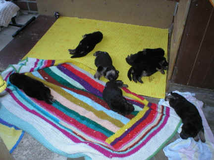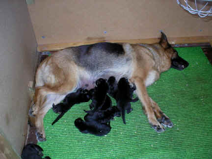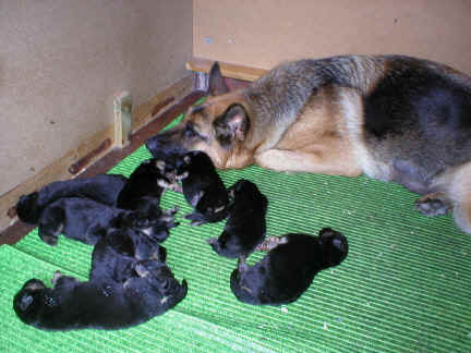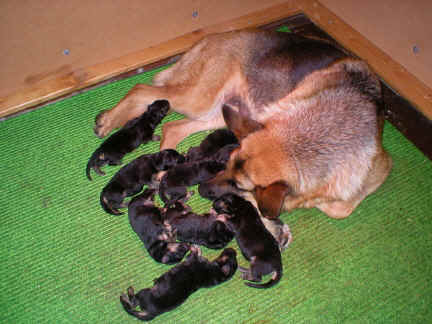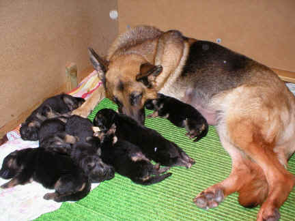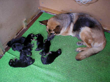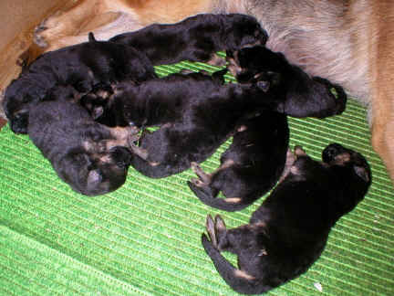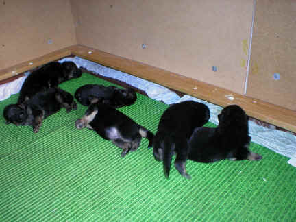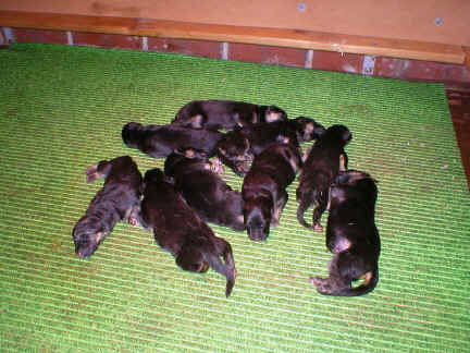 | hier sind es noch 9, leider ist ein Mädel gestorben, zum Glück sind noch 3 übrig | so sind es nun 5 kräftige Rüden und 3 niedliche Hündinnen | und eine stolze Mama Brisby |