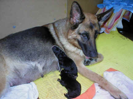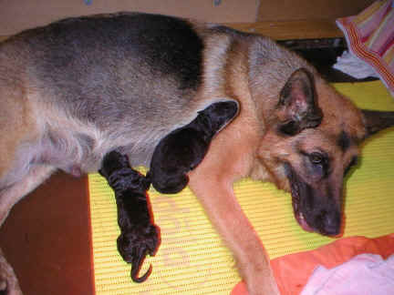 | nun sind es schon 3 süße kleine Welpen, 2 Rüden und 1 Hündin | man bin ich jetzt schon k.o. die Abstände waren ganz schön groß | so, und nun sind alle Welpen da, ist das ein Gewimmel, ob ich das schaffe ? |
