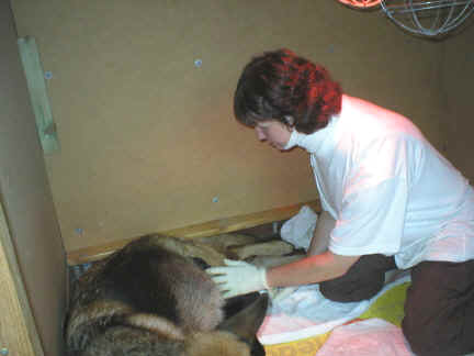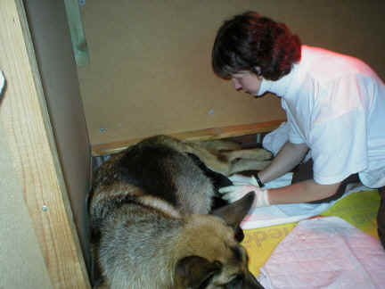 Unsere Namen haben wir ja alle bekommen, wenn wir auch wieder umgetauft wurden. Aus dem Droll wurde der Dagoh, der Name ist viel schöner findet Bärbel und aus der Danja wurde eine Dixie. Den Namen haben Irmgard und Armin ausgesucht, die neuen Leute von Ihr. Bärbel hat sich aber immer mal wieder vertan und hat Danja gerufen, den Sie ganz gut fand. Wichtig ist aber das der Name den neuen Leuten gefällt. Gestern wurden wir von unserem Freund den Dr. Stock geimpft, aber vorher ganz gründlich untersucht. Erst mal genau inspizieren, dann die Lunge abhorchen, den Bauch abtasten, Die Augen anleuchten, die Zähne schauen, in die Ohren schauen, Hoden gesucht und alle gefunden :-) bei den Jungen, ja was war noch, ach ja, weil wir putzmunter und gesund waren, bekamen wir zur Belohnung eine Impfe. Aber wir haben es gelassen hin genommen denn Bärbel hat uns Leckerlis hin gehalten, wer denkt denn da noch an die Impfen??? Dr. Stock war total mit uns zufrieden und meinte wir sehen ganz toll aus und haben super Farben. Frauchen Bärbel fand das toll, denn die findet uns sowieso ganz toll. Heute ist Mittwoch, also der Tag vor dem Tätowieren und es geht uns gut. Die Impfen haben wir ohne Probleme hin genommen und was wir heute nicht so gut fanden, dass es regnete und wie: Bärbel war mit Mutter Emmi beim Arzt und dann fing es später an zu regnen. Glaubt ja nicht, das wir angst vor dem Regen hatten. Wir sind alle tapfer draußen geblieben und nur später etwas zum Schlafen rein gegangen. Unsere Türen stehen ja immer los. Als Bärbel dann wieder kam, waren wir ein paar nasse Ratten. Aber Sie hat uns mit vielen Handtüchern trocken gerubbelt und den Raum angewärmt so das wir schnell trocken wurden. In der Zwischenzeit bekamen wir Leckerlis, ganz leckere Ochsenziemerstücke. Kann man lange dran kauen. Dann wurde unsere Tür zu gemacht und Bärbel hat unsere Freunde versorgt. Die waren nicht so nass wie wir. Ach ja, da war ja nur die nasse Mama und der nasse Papa - die Chandrah ist im Auto mit gefahren und hat auf gepasst das Bärbel nicht vergisst Leckerlis zu kaufen. Hat Sie nicht !!! So für heute genug, morgen erzählt Bärbel wie tapfer wir bei dem Tätowieren waren, eure Speicherseewelpen Dagoh, Daryx, Dayven, Darah, Dayrah, Dixie |